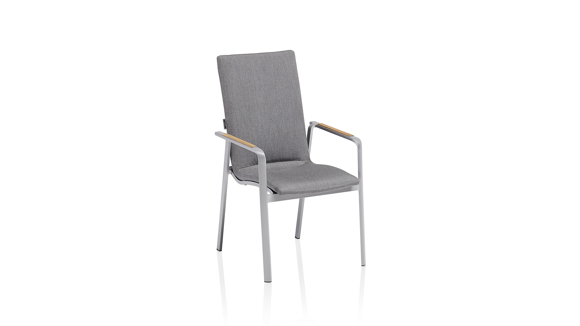 Eine stylische und natürliche Optik im Outdoor-Esszimmer wird durch Onlay-Armlehnen aus FSC®- zertifiziertem Teak-Holz bei allen Sesseln erzeugt.