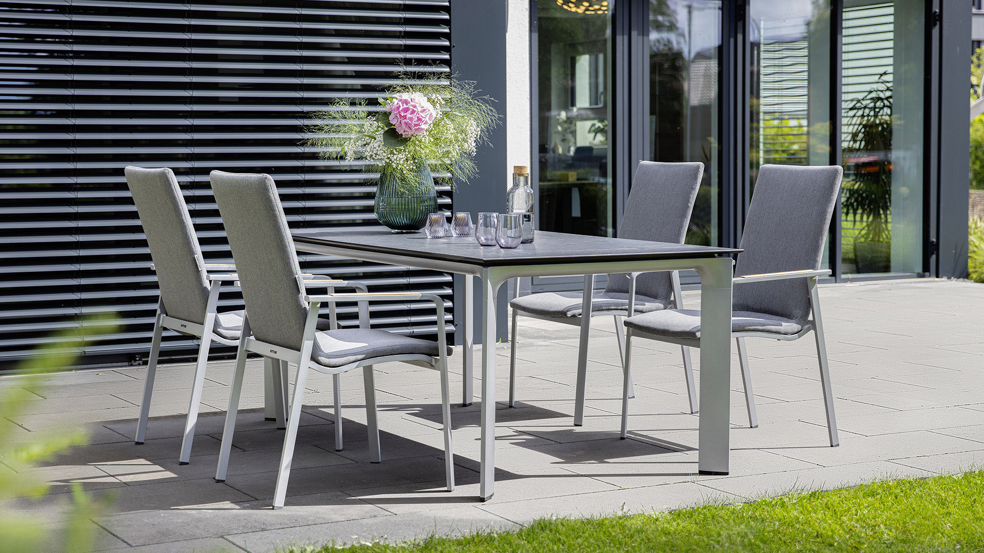 Eine stylische und natürliche Optik im Outdoor-Esszimmer wird durch Onlay-Armlehnen aus FSC®- zertifiziertem Teak-Holz bei allen Sesseln erzeugt.